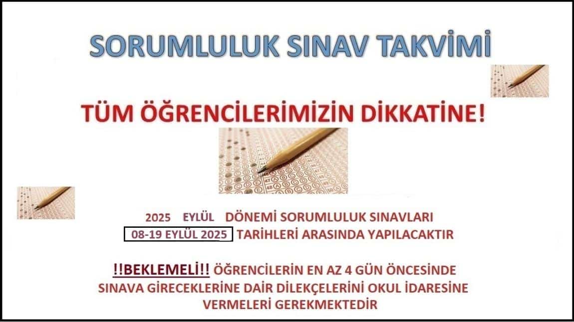 2025-2026 Eğitim Öğretim Yılı 1. Dönem EYLÜL Ayı Sorumluluk sınavları 08-19 EYLÜL 2025 tarihleri arasında yapılacaktır.