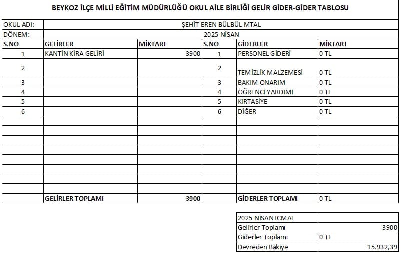 Okul Aile Birliği Gelir Gider Tablosu